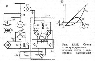 фазовое компаундирование с коррекцией напряжения; в схеме переменный ток от устройства компаундирования определяется геометрической суммой Iг и тока, пропорционального Ur, и зависит от тока корректора напряжения. Общий переменный ток выпрямляется; среднее значение выпрямленного тока пропорционально току Iг, напряжению Ur и углу φ сдвига фаз между ними.
