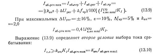 Пренебрегая наличием Iс. р min и 0,8IТ-НОМ, с некоторым запасом получим kтрм=Iс. р/Iтрм. Отношение токов в реле Iс. р/Iтрм равно отношению соответствующих первичных токов Iс. з/I(3)к. вн mах. Из (13.9) максимальный первичный ток небаланса