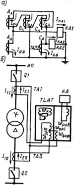 Рис. 13.9. Схема дифференциальной отсечки (а) и дифференциальной токовой защиты двухобмоточного трансформатора с промежуточными насыщающимися трансформаторами тока (б)
