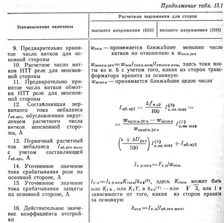 Действительный коэффициент отстройки должен быть не менее 1,3. Если kотс<1,3, то следует принять для основной стороны новое число витков ωосн меньше по отношению к принимавшемуся ранее (см. п 9). Затем повторить расчет по п. 10—16. Расчет повторяется до тех пор, пока действительный коэффициент отстройки не окажется примерно равным или большим 1,3. Для окончательно выбранного тока срабатывания защиты определяется значение коэффициента чувствительности. Он должен удовлетворять условию (13.13).