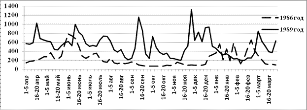 Рис. 1 «Гидрографы внутригодового распределения притока речных вод к Краснодарскому водохранилищу для 1986 и 1989 гг.».