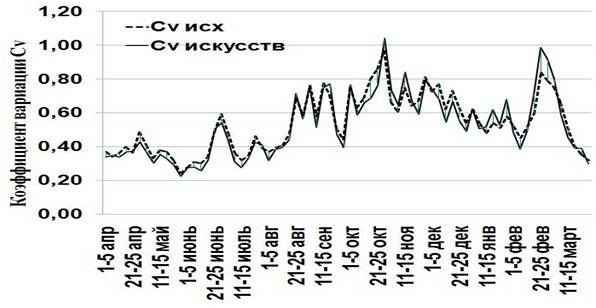 Рис. 2 «Соотношение коэффициентов вариации по внутригодового распределения для естественного и смоделированного рядов»