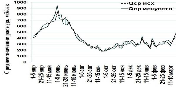 Рис. 3 «Соотношение средних расходов притока по внутригодового распределению для естественного и смоделированного рядов»