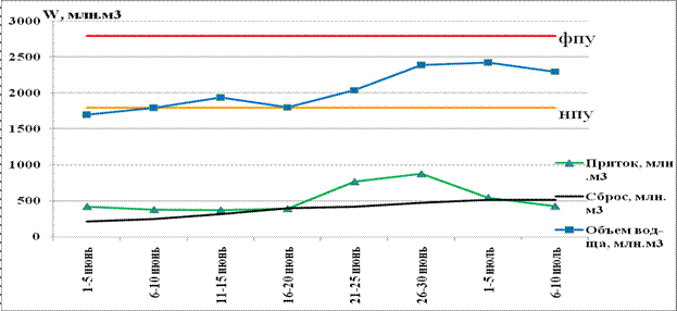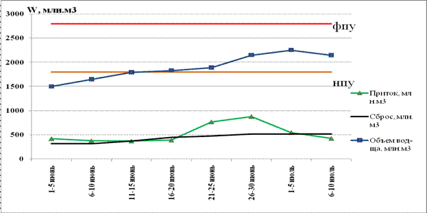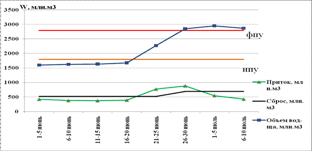 В основе модели функционирования водохранилища было положено обычное балансовое уравнение для наполнений водохранилища по пентадным внутригодовым интервалам.