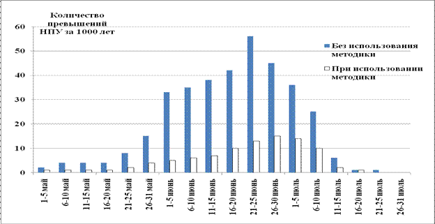 На рис. 8 показана частота превышения НПУ на Краснодарском водохранилище за 1000 смоделированных лет при применении методики оперативного управления и без ее применения соответственно. Из анализа рисунка видно, что наибольшую опасность представляет период с 10 июня по 10 июля, так как именно в этот внутригодовой интервал существует значительная вероятность ущерба от аварийной ситуации на гидроузле.
