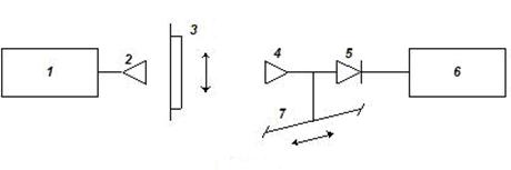 1 – генератор высокочастотный; 2 – перемещающаяся антенна (рупор); 3 – исследуемая диафрагма; 4 – приемная антенна (рупор); 5 – детекторная секция; 6 – индикатор (микровольтметр В6-4); 7 – передвижная каретка.