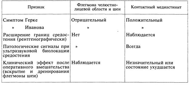 Дифференциальная диагностика. Схемы дифференциальной диагностики медиастинитов, в том числе одонтогенного происхождения, предложены в разные годы , , H. Г. Поповым. Основные критерии распознавания флегмон челюстно-лицевой области и шеи приведены в таблице.