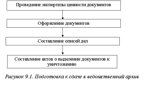 Подготовка дел к передаче в архив для дальнейшего хранения включает в себя: экспертизу ценности документов, оформление документов, составление описей дел, составление актов о выделении документов к уничтожению. Эта процедура позволяет выделить для хранения наиболее ценные и значимые документы. Схема подготовки документов к сдаче в ведомственный архив приведена на рисунке 9.1.