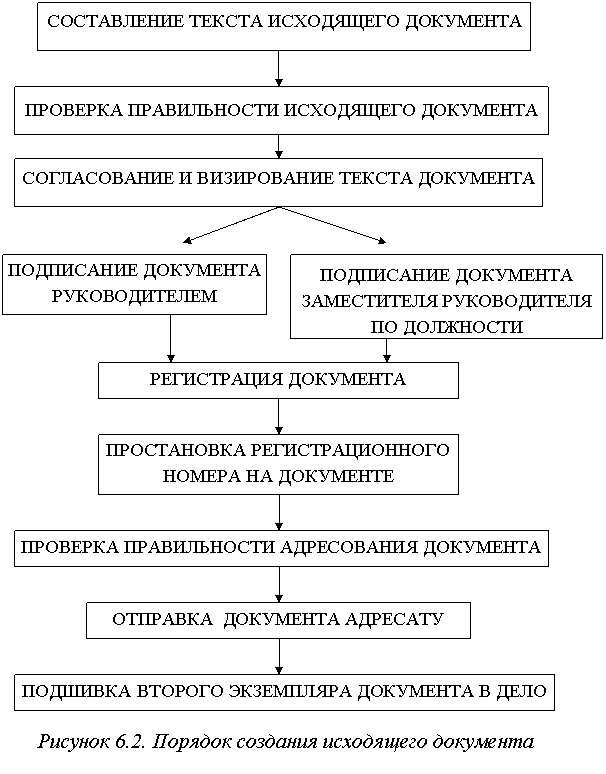Проект исходящего документа составляет исполнитель, правильность его оформления проверяет секретарь. Исходящие документы оформляются в двух экземплярах, за исключением факсов и телефонограмм, составляемых в одном экземпляре. Проект исходящего документа может быть согласован как со специалистами других организаций (учреждений), так и внутри организации (Рисунок 6.2).
