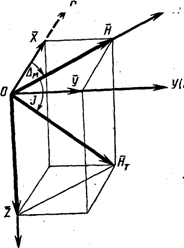 Полная напряженность магнитного поля может быть разложена на составляющие: вертикальную Z, направленную к центру Земли, и горизонтальную H, расположенную в плоскости истинного горизонта (Рис. 2). Сила Н направлена по горизонту вдоль меридиана и является единственной силой, удерживающей магнитную стрелку в направлении магнитного меридиана.
