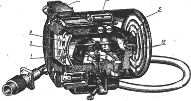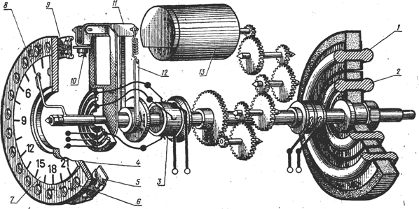 1-статорная обмотка сельсин-приемника; 2- роторная обмотка сельсин-приемника;3-щетки потенциометров; 4 - основание; 5 - лекальная лента; 6 -головка девиационного винта; 7 - шкала 8 - стрелка 9 - девиационный винт 10 - ролик; 11 - качающийся рычажок; 12 - гибкая лента! 13 - отрабатывающий двигатель ДИД-0,5 ,