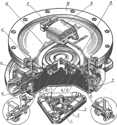 1 - сердечник чувствительного элемента; 2 - катушка намагничивания; 3 - сигнальная катушка; 4-пластмассовая платформа чувствительных элементов;5-внутреннее кольцо кардана;. 6-полая ось кардана; 7-пробка; 8-поплавок; 9 - девиационный прибор; 10 - зажимное кольцо; // - зажим; 12 - крышка; 13-уплотнительяая прокладка; 14-наружное кольцо кардана; 15 - корпус датчика; 16,- полая ось кардана; 17- чашка; 18-груз