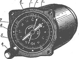 Указатель УГР-1 (Рис. 7) показывает магнитный курс и углы разворота самолета по шкале курса 1 относительно неподвижного индекса 2. Пеленги радиостанций и самолета определяются по положению стрелки радиокомпаса 5 относительно шкалы 1. Курсовой угол радиостанции отсчитывается по шкале 7 и стрелке 5.