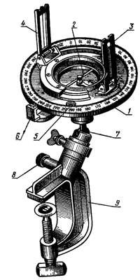 1 - азимутальный лимб; 2 - магнитная стрелка; 3 - глазной диоптр;4 - предметный диоптр; 5 - сферический уровень; 6 - курсоотметчик МК; 7 - шаровой шарнир; 8 - винт крепления лимба; 9 – кронштейн.