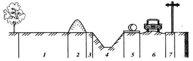 | Рис. 5.3. Полоса отвода земель под строительство одного трубопровода: 1 — полосы для работы бульдозера при засыпке траншей; 2 — отвал; 3 — бровка; 4 — траншея; 5 — площадка для сборки и укладки труб; 6 — грунтовая дорога; 7 — линия связи |
