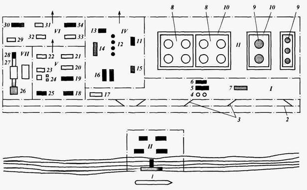 Рис. 6.1. Схема разбивки генерального плана водно-железнодорожной нефтебазы: 1 — причал; 2 — железнодорожные пути для маршрутов; 3 — сливно-наливные эстакады; 4 — нулевые резервуары; 5 — контора (насосная]; 6 — узел задвижек; 7, 31 — лаборатории; 8 — резервуарные парки; 9 — мерники; 10 — обвалование; 11, 15, 16, 18, 19, 25 — склады; 12 — автоколонки; 13 — автовесы; 14 — разливочная; 17 — разгрузочная площадка; 20 — котельная; 21, 22, 23 — механические мастерские; 24 — водонасосная; 26 — иловые площадки; 27 — нефтеловушка; 28 — песколовка; 29 — административный корпус; 30 — контора; 32 — электростанция; 33 — пост ВОХР; 34 — пожарное депо |