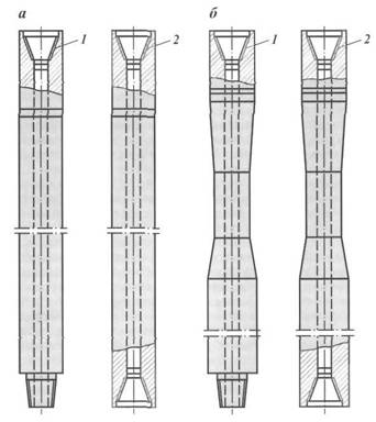 Изготовляют УБТ двух типов: гладкие по всей длине (рис. 2.10, а) и с конусной проточкой (рис. 2.10, б) для лучшего захвата их клиньями во время спуска и подъема бурильной колонны. Комплект утяжеленных бурильных труб имеет одну наддолотную трубу 2 с выполненной на обоих концах внутренней замковой резьбой и несколько промежуточных труб 1, снабженных на верхнем конце внутренней, а на нижнем — наружной замковой резьбой.