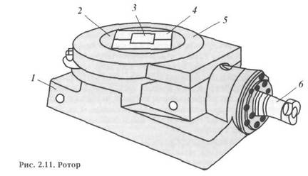 Ротор (рис. 2.11) состоит из станины /, во внутренней полости которой установлен на шариковом подшипнике стол 2 с укрепленным зубчатым коническим венцом, вала 6 с цепным колесом с одной стороны и конической шестерней — с другой, кожуха 5, ограждающего периферийную часть вращающегося стола, вкладышей 4 и зажимов 3 для ведущей трубы.