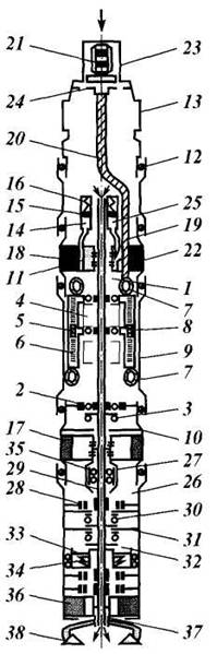| Рис. 2.12. Электробур с маслонаполненным шпинделем: 1 — вал электродвигателя; 2, 5 — радиальные подшипники; 3, 30 — опорные подшипники; 4, 6 — секции электродвигателя; 7 — обмотка статора; 8 — диамагнитный пакет; 9, 10, 11 — соответственно верхняя, средняя и нижняя части корпуса; 12 — корпус лубрикаторов; 13, 37 — переводники; 14, 25 — лубрикаторы; 15, 33 — поршень лубрикатора; 16,34 — пружина лубрикатора; 17, 18 — сальниковые уплотнения; 19 — пара торцовая уплотнения; 20 — кабельный ввод; 21 — контактный стержень; 22 — уплотнение ввода кабеля; 23 — предохранительный стакан; 24 — опора контактного стержня; 26 — корпус шпинделя; 27 — соединительная муфта; 28 — роликовая опора; 29 — вал шпинделя; 31 — резиновый амортизатор; 32 — лубрикатор шпинделя; 35 — втулка с уплотнением; 36 — сальник шпинделя; 38 — долото |