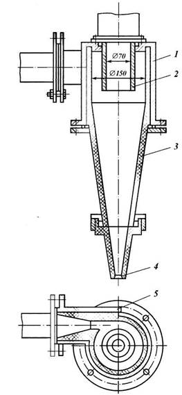Эффективным очистным устройством глинистых растворов является гидроциклон. Гидроциклон (рис. 2.14) состоит из вертикального цилиндра 1 с тангенциальным подводным патрубком 5, конуса 3, сливной трубы 2 и регулировочного устройства с насадкой 4. Промывочный раствор под избыточным давлением 0,2 — 0,3 МПа по тангенциальному патрубку 5 поступает в цилиндр 1 и приобретает вращательное движение. Под действием центробежной силы более тяжелые частицы отбрасываются у периферии, а наиболее легкие концентрируются в центральных и средних участках гидроциклона. При высокой скорости вращения потока в гидроциклоне вдоль оси образуется воздушный столб, давление в котором ниже атмосферного. Осевая скорость на границе этого столба максимальна и направлена вверх, а на стенках гидроциклона осевая скорость направлена вниз.
