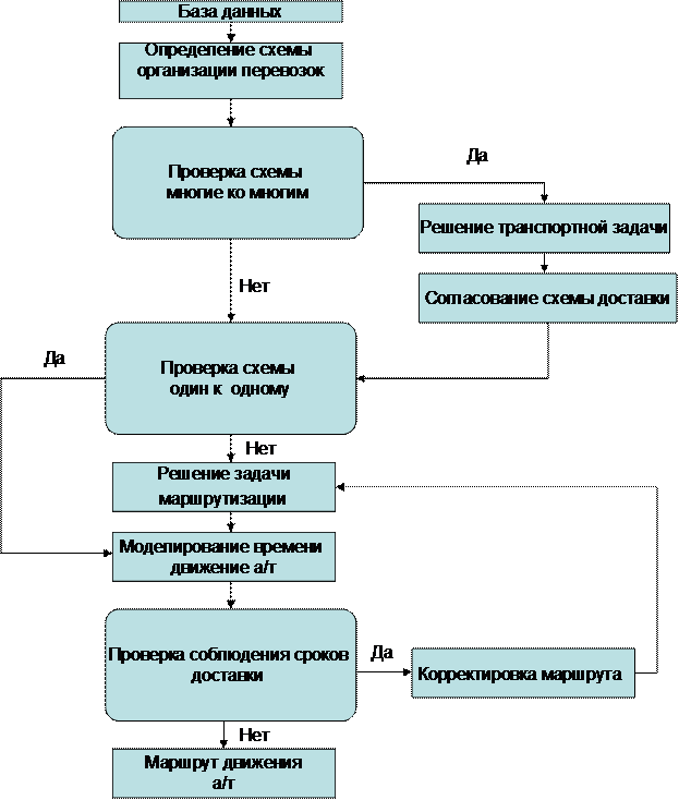 5) Далее проверяется условие: используется ли при перевозке груза схема “один к одному”. Если условие не выполняется, то перевозка осуществляется по схеме “один к многим”, которая требует решение задачи маршрутизации.