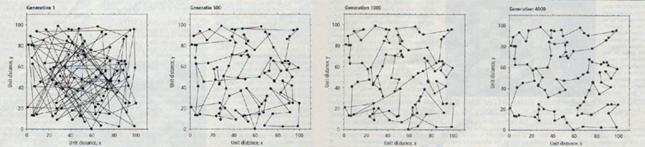 Рис.4 : Генетический алгоритм использовался при решении задачи коммивояжера на 100 городов. В начале генерировалась начальная популяция, состоящая из 100 случайных решений, из них при помощи мутации и кроссовера создавались 100 потомков. Таким образом, получалось 200 решений. 100 лучших решений выбирались для следующей популяции. Лучшие решения после 500, 1000 и 4000 итераций показывают процесс улучшения качества решений. Улучшение качества решений на каждом из последующих этапов эволюции заметно невооруженным взглядом (программу, решающую подобный пример, можно найти в разделе публикаций на сайте www. ).
