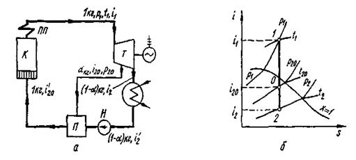 диаграммой. Для этого рассмотрим схему и регенеративный цикл п. с.у. с одним отбором (рис. 9). Пересечение адиабаты расширения 1 – 2 (рис. 9,б) с изобарой отбора