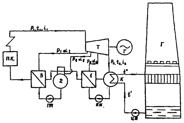В паровой котел ПК поступает питательная вода из подогревателя 3, подаваемая под давлением питательней насосом (ПН). В топке котла при сгорании пылевидного топлива образуются продукты горения высокой температуры, передается тепло воде, протекающей по трубам, в которых образуется пар. Собираемый пар в барабане котла протекает через пароперегреватель и перегревается до температуры выше насыщения. Из котла пар по трубопроводу поступает в паровую турбину (Т) с параметрами