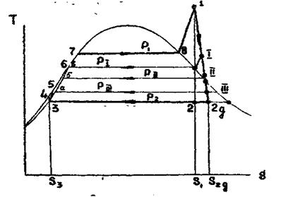 Действительный процесс расширения пара в турбине показан на схеме линией 1-2 д. Точки I, II, III характеризуют состояния пара в отборах турбины. Процесс конденсации пара представлен изотермой 2g–3, которой соответствует давление пара