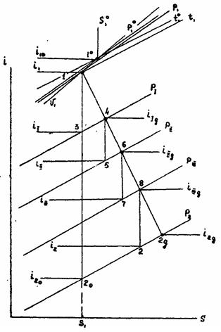 диаграмме, между изобарами Рl и РI. Так как величина относительно внутреннего КПД рассматриваемой группы ступеней турбины задана, то с помощью (14) легко находится энтальпия