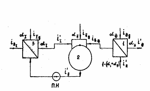 В смешивающем подогревателе поступающий пар второго отбора непосредственно соприкасается с водой, отдает тепло парообразования воде, подогревая ее до своей температуры конденсации. Таким образом, в подогревадеаэраторе) смешиваются три потока: пар II-го отбора, питательная вода из 1-го подогревателя и конденсат пара 3-го подогревателя. Пар, поступающий во 2-й подогреватель, конденсируется, и вся смесь воды приобретает температуру конденсата пара. Питательный насос (п. н.) подает воду в подогреватель 3 высокого давления. Энтальпия воды –