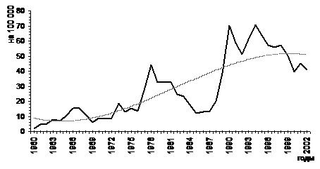Рис. 2 Заболеваемость сальмонеллезами в Республике Беларусь в 1954 – 2002 гг.