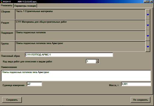 Предположим, надо создать новый материал, которого нет в нормативной базе - потолки подвесные типа "Армстронг". Поискав в нормативной базе, Вы пришли к выводу, что наиболее подходящий ресурс с поисковым образом (ПО) С "Плиты покрытий асбестоцементные" (не заботьтесь о достижении максимального соответствия, т. к. это не принципиально и это Вы поймете чуть позже).