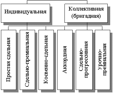 Сдельная оплата может быть индивидуальной или коллективной (бригадной) и при этом подразделяться на простую сдельную, сдельно-премиальную, косвенно-сдельную, аккордную, сдельно-прогрессивную, урочно-премиальную и др.
