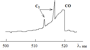 Молекулярные полосы С2 и СО на участке спектра от 512 до 520 нм являются излучением соответствующих продуктов реакции.