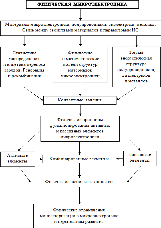 Отличительной чертой концептуальной диаграммы физической микроэлектроники является то, что она акцентирует внимание на тех физических закономерностях, которые лежат в основе функционирования изделий микроэлектроники, без понимания которых немыслим прогресс в этой области.