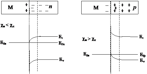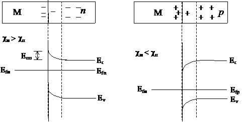Учитывая различие работы выхода металла и полупроводника n-типа или p-типа, априори можно утверждать, что при их контакте образуется потенциальный барьер даже при отсутствии внешнего электрического поля. Высота этого барьера будет отражена величиной искривления энергетических зон.