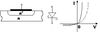 Барьер Шотки возникает при контакте металла с сильно легированным полупроводником n-типа. Контакт металл–полупроводник может быть как омическим, так и выпрямляющим. В выпрямляющем контакте, который называют диодом Шоттки, cm > cp и электропроводность обусловлена основными носителями зарядов. В нем, по сравнению с обычным диодом, более высокая скорость переходных процессов, низкое напряжение отпирания, более крутая вольтамперная характеристика в положительной области. Структура диода Шотки, его условное обозначение и вольт-амперная характеристика представлены на рис. 7.4.