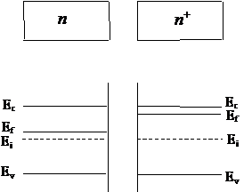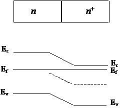 В контакте двух полупроводников одного типа проводимости, но различной степени легирования (n–n+ и p–p+), как и для обычных p–n-переходов, высота потенциального барьера определяется концентрацией основных носителей заряда. Однако в данном случае не образуется слой с малой концентрацией заряда. Поэтому сопротивление структуры определяется ее высокоомной областью. В таком контакте происходит диффузионный перенос зарядов и не образуется двойной слой, а реализуется лишь плавный переход от n к n+, отсутствует инжекция неосновных носителей заряда. После установления равновесного состояния уровни Ферми выравниваются. Контакт всегда омический. Энергетическая зонная структура такого контакта представлена на рис. 7.5.