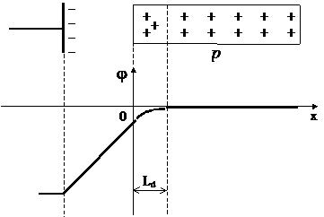 Область объемного заряда у поверхности полупроводника распространяется на так называемую «дебаевскую» длину экранирования