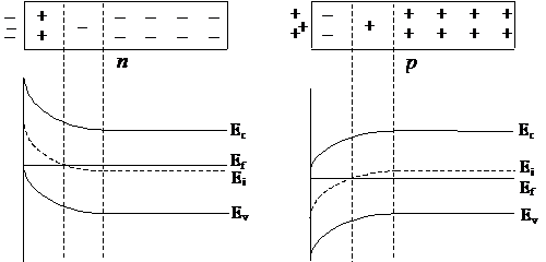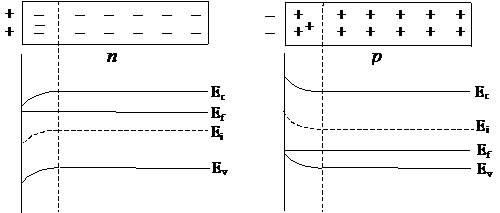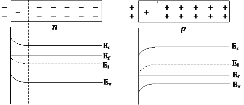 Из формул (7.11) и (7.12) следует, что если Ef > Ei, (уровень Ферми расположен выше середины запрещенной зоны), то (Ef – Ei) > > 0, n > ni > p, и полупроводник в приповерхностной зоне обладает электронной проводимостью независимо от типа собственной проводимости. Если Ef < Ei, то (E – Ei) < 0, n < ni < p, и полупроводник обладает дырочной проводимостью. При Ef = Ei полупроводник ведет себя как собственный.