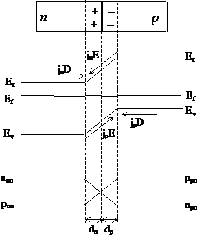 барьер понижается и диффузионный ток через p–n-переход становится больше дрейфового. Через p–n-переход будут проходить в основном диффузионные токи, обусловленные движением электронов из n-области в p-область и дырок из p-области в n-область. Этот процесс называется инжекцией неосновных носителей заряда; p–n-переход считается открытым.