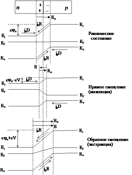 Рис. 8.2. Зонная энергетическая структура p–n-перехода под внешним потенциалом