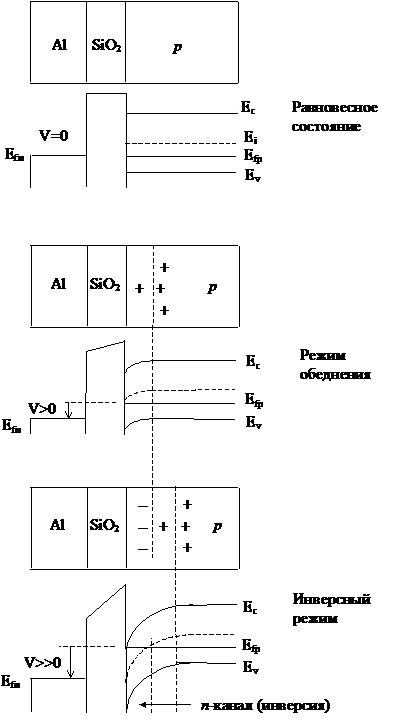 Приведенные зонные диаграммы полевого транзистора составлены в предположении, что диэлектрик не содержит зарядов, а алюминий и кремний имеют одинаковую работу выхода, поэтому их уровни Ферми совпадают. Причины искривления энергетических зон в приповерхностном слое полупроводника обусловлены эффектом поля. Отметим, что инверсный токопроводящий канал образуется при условии, когда к затвору прикладывается знак потенциала идентичный типу проводимости подложки, а его величина должна быть выше пороговой и обеспечивать режим инверсии.
