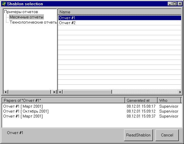 Правое окно содержит список Шаблонов для выбранного в левом окне элемента. Двойной щелчок на некотором шаблоне делает доступной кнопку ReadShablon. При этом в нижнеи окне выводится список ранее сохраненных отчетов для данного шаблона. Правый щелчек открывает меню редактирования списка шаблона: