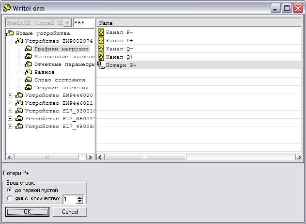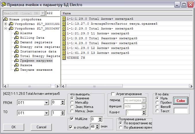 Выполняем навигацию по БД Электро для поиска необходимого нам параметра – в нашем случае «1-1:1.29.0 Total Актив+ интеграл5». Выполняем двойной щелчек на выбранном параметре (правое окно), наблюдаем появление его наименования в нижней части формы.