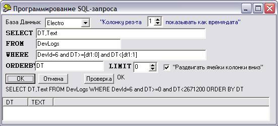 Укажем наименование БД (Electro), поля для вывода (DT, Text), имя таблицы (DevLogs) и условие выборки (DevId=6 and DT>=[dt1:0] and DT<[dt1:1]).