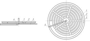 Рисунок 1 – Дисковый сепаратор со спиральной магнитной системой а) общий вид сепаратора; б) вид снизу (1 – ферромагнитный диск; 2 –магниты; 3 – немагнитный разгрузочный диск; 4 – скребок)