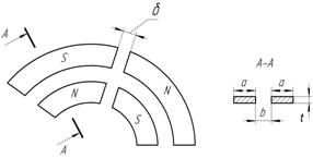 На рис. 2 показан фрагмент спиральной магнитной системы дискового сепаратора, содержащий четыре секторообразных магнита, с указанием основных конструктивных параметров: d – воздушный зазор; а – поперечный размер (ширина) магнита; b – расстояние между соседними витками спирали; t – толщина магнитов (принималась неизменной, равной t=12,5 мм). Численные значения конструктивных параметров магнитных систем, задаваемых при моделировании, и расчетные массы постоянных магнитов для каждой из моделей представлены в табл. 1.