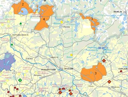 1 – Республиканский ландшафтный заказник «Синьша»; 2 – Республиканский ландшафтный заказник «Освейский»; 3 – Республиканский ландшафтный заказник «Козьянский»; 4 – Республиканский ландшафтный заказник «Красный Бор».